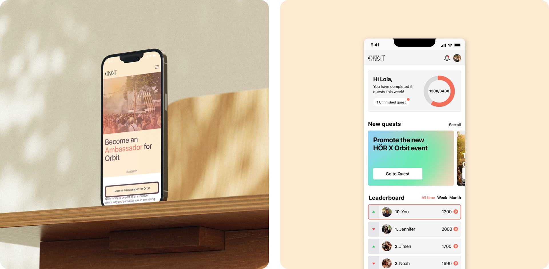 Met functies als Quests, Rewards en een centrale Feed krijgen gebruikers duidelijke doelen, directe feedback en controle over hun beloningen. Door een gestroomlijnd ontwerp en heldere visuele hiërarchie wordt de ervaring intuïtief en motiverend. Het leaderboard-element voegt daar een competitieve laag aan toe die de community versterkt.